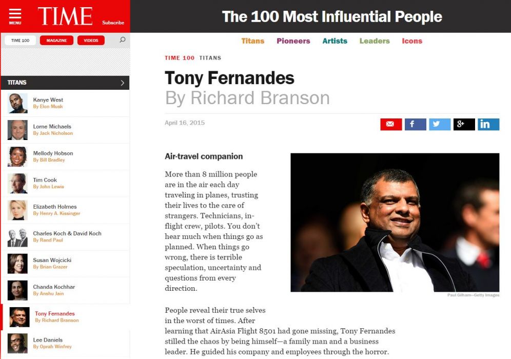 The CEO of the Tune Group got a stellar testimonial from fellow airline owner and financial titan Richard Branson, who wrote: “With his strength, candor and compassion, Tony helps get AirAsia’s passengers home every day. And he continues to lead a company that has earned the trust of travelers.”