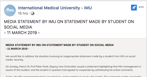 In a post to their Facebook page, IMU pointed out that it has had a social media policy in place since 2012 that students are required to adhere to.
