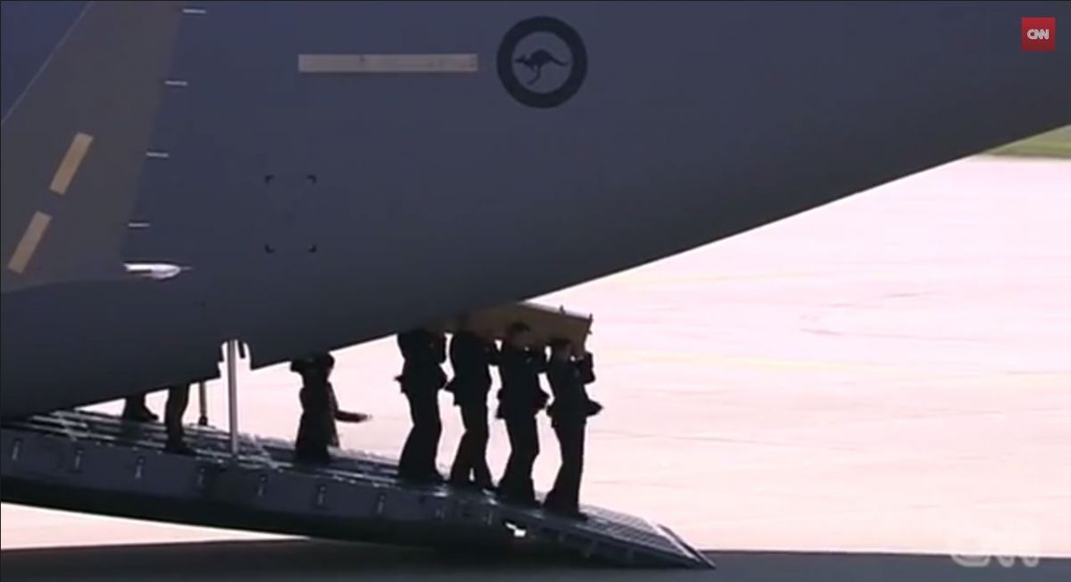 The bodies carried out of the C-17 military aircraft were encased in blank caskets without national identification, to illustrate the shared grief of all nations involved. The procession was accompanied by a rendition of “The Last Post”.