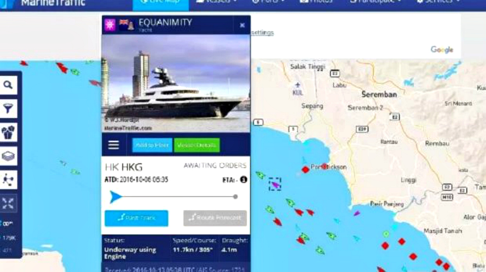 According to news portal Malaysiakini, ship tracking website Marinetraffic.com showed that the luxury yacht named Equanimity cruising just over 16 kilometres off the beaches of Port Dickson heading northwest at around 1.30pm.