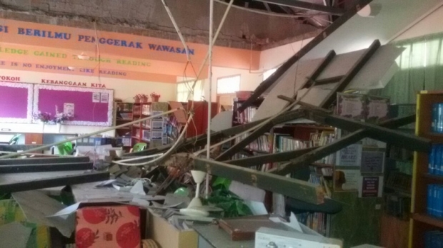 Bernama reports that the ceiling in Sekolah Menengah Kebangsaan Agama Mohamad Ali’s library crumbled at 10.55am. No one was injured.