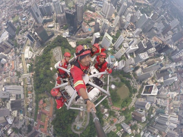 The people in this epic wefie (Mohd Ashraf Fakhruddin, Adam Tun Tuah, Ayen Mahidin, Shahrul Rizam, and Saleh Mokhtar) are a professional crew fromRopequest Sdn. Bhd. who provide cleaning and maintenance services for high rise buildings or spaces that are areas that are difficult to be accessed.