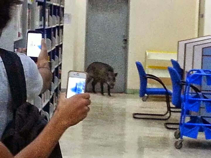 UPDATE: the boar was removed from the library with extreme measures, it seems. The animal was herded and beaten with a heavy bamboo cane in the MMU library – to the consternation of many who saw the viral images that followed. We have more on Malaysians’ reactions to the brutal treatment here.