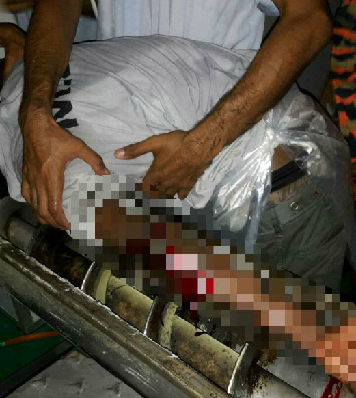 A Bangladeshi worker nearly lost his left hand when it became trapped in a spice-mixing machine at a factory in Rayani, Kuala Lumpur on Saturday.