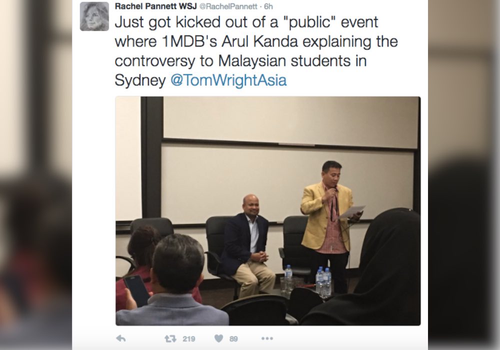 “Just got kicked out of a ‘public’ event where 1MDB’s Arul Kanda explaining the controversy to Malaysian students in Sydney,” Rachel tweeted.