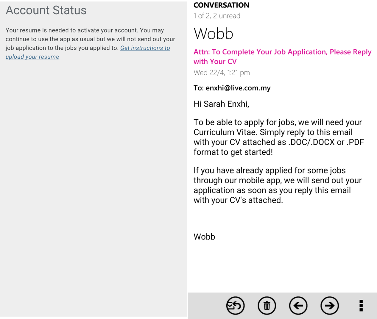 Left: What’s displayed in my app account. Right: The email sent to remind me to send them my CVWhat would complete the whole Tinder-feel, of course, is if a notification pops up saying “It’s A Match!” if the company ‘likes’ you too, and if you could proceed to initiate a conversation with the hiring manager of the company.