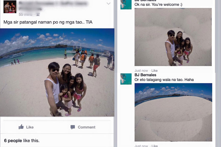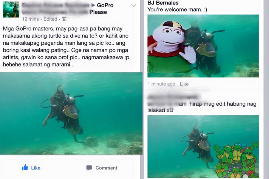From ‘Gopro Users Philippines Pa-edit Po’ page. Members there ask for their (mostly) vacation photos to be enhanced/edited for free. But you won’t find it on Facebook anymore. They switched their settings from closed to a secret the day my ‘portfolio’ went viral. Biglang dumami ata friend requests nila, Dumami rin bigla ang mga nagpapa-edit. I left the group yesterday, hindi na rin ako makabalik.