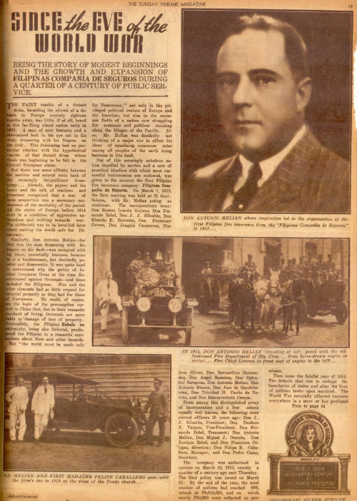 The company’s print advertisements at that time boasted that it was a company that can be trusted, with prominent businessmen like Francisco Ortigas, and Melian’s brothers in law, Fernando Zobel and Enrique Zobel, on its board. Three years later he opened Filipinas Campania de Seguros, the first local-owned fire insurance company.