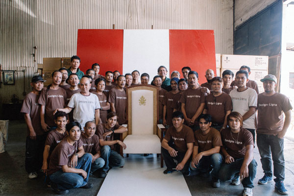De Lange called on friends to help him execute the design: Betis Crafts of Pampanga did the solihiya weaving while the papal crest was done in Iloilo by a group called WUTHLE (Women United Through Handcrafted Lace And Embroidery), under the supervision of Sisters Gemma Abellana and Inday Mendres.
