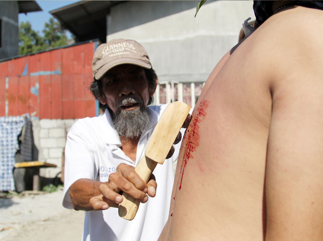 His wife was born in Bgy San Pedro and his father-in-law makes “burullos,” a wooden instrument shaped like a brush with shards of glass as bristles, used to slice the skin open. It is used by flagellants to heighten the pain during flogging.