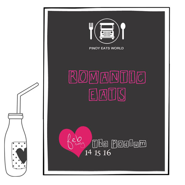 Feb 14-16. Pinoy Eats World brings together a slew of chefs and bakers to make for Romantic Eats, a food fair at the Podium. Consider the following: LES Bagels, Risa Chocolates, Slik Road, Scarsdale, Banh Mi, Homemade Treasures, with music from The Library Kids. The Podium, Ortigas