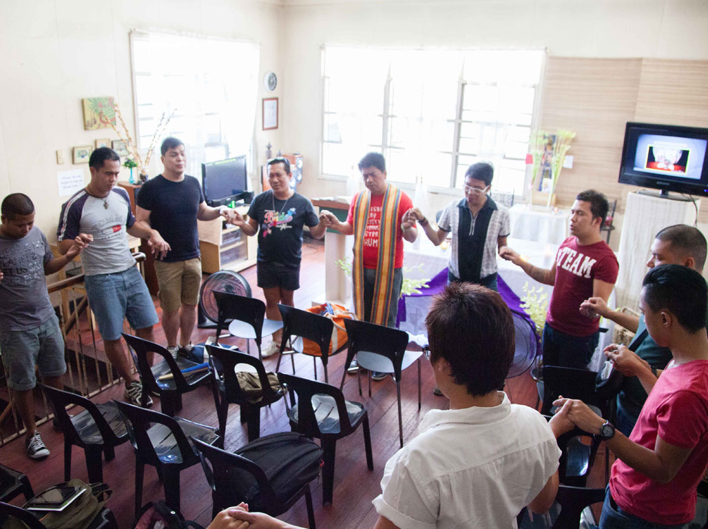 Here in Makati, Edgar Constantino is the flock leader. “You’re welcome here as long as you believe in God,” he tells Coconuts Manila. This Sunday, there are 10 people in the room, all fit gay men wearing body-conscious shirts, shorts and flashy sneakers. There is only one lesbian in the crowd, Myla, who also happens to be the landlord. The furniture have been pushed against the wall to make away for a makeshift altar, decorated to reflect a feminine touch.