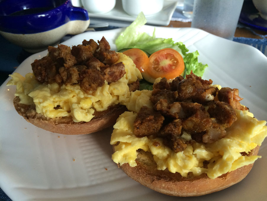 Eggs 360, an open-faced sandwich of chunks of longganisa on a bed fried egg