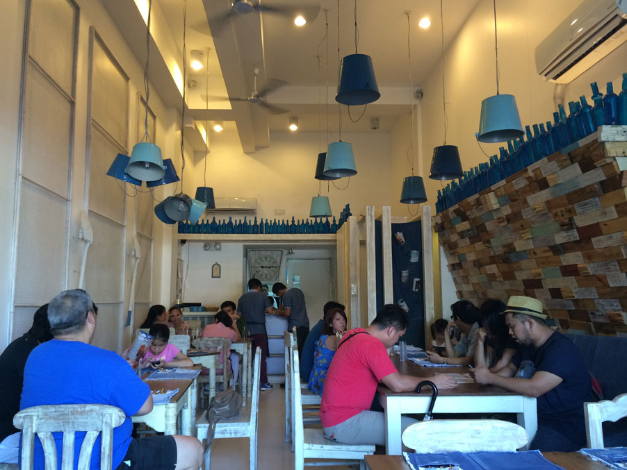 It’s a narrow joint decorated to make you feel like you were in a country beach house — there are a couple of paddles as accents on the white walls. Across it, distressed wooden panels define the couch seatings. Pails hanging from the high ceiling are used as chandeliers. And wow, so much denim. We especially like the placemats — made with old denim pants, they feature jeans pockets where utensils are neatly tucked in.