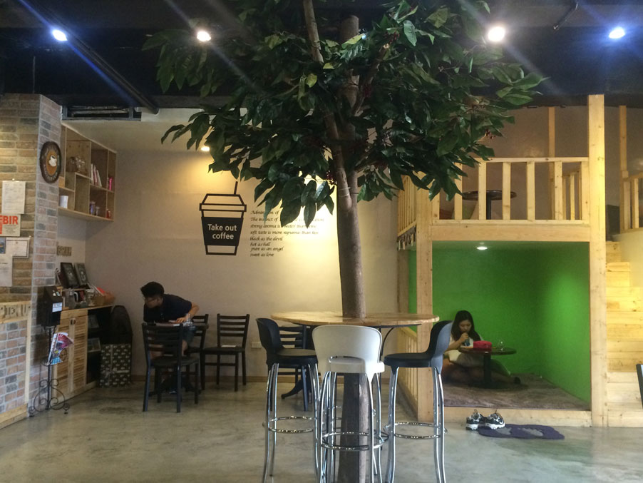 Enter the coffee shop and you’d be delighted to see a roomy, sparsely decorated space with nice hiding places — you know, for when you want to be alone, or don’t feel like talking to people. There’s a tall, fake tree right in the middle of the café, which looks and feels like a friendly demarcation of the different areas in the cafe. It’s also a bar that can seat four.