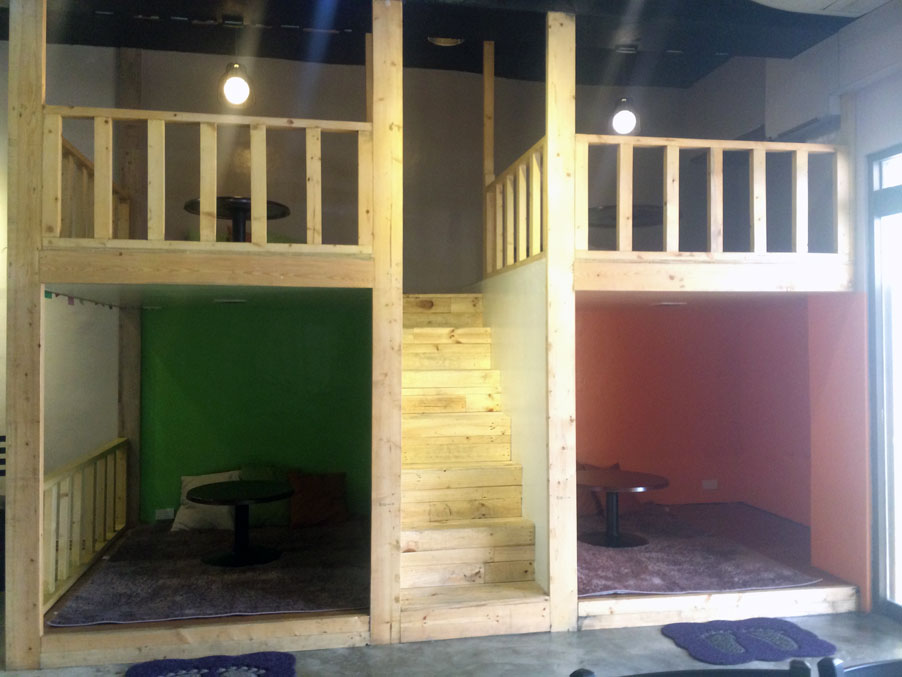 Immediately, you will notice the wooden structure on your right. It’s a double-deck nook that makes for four segregated, low-ceilinged private spaces. Here you can remove your shoes, sit on the carpeted floor, and hang out. There’s a narrow stairs that lead up to the second floor of the nooks — perfect for when you really need your space and/or for people watching.