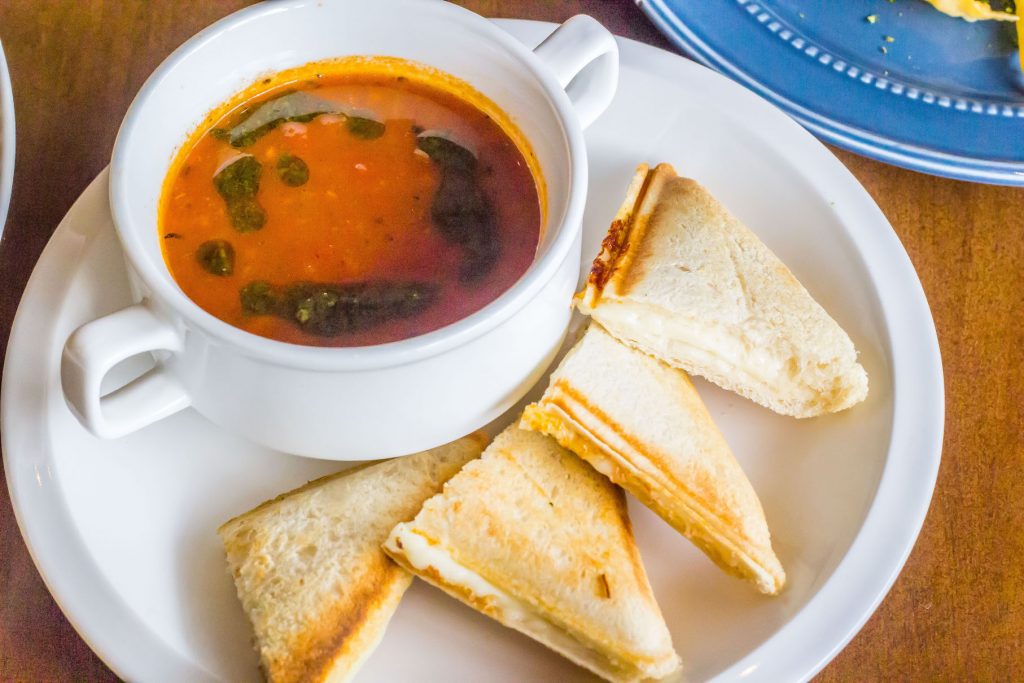 The tomato soup was tangy, herby, and a little sweet, while the Kesong Puti grilled cheese sandwich gave the dish the saltiness it needed.