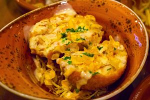 This is definitely not your typical Gambas. It’s sweet-from-freshness, succulent shrimp cooked in garlic infused olive oil with roasted garlic for that added aroma and flavor. For added crunch, it’s topped with garlic chips and garlic chives. Our only complaint? It was gone in seconds.