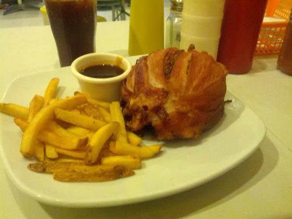 Being the real meat-lover that I am, I decided to crank it up to eleven and go overboard. I decided to order that one meal that isn’t even on the menu and costs P230 with fires and drinks. The Deep- Fried Bacon Wrapped Burger.