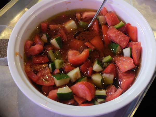 The salad was a simple recipe using tomatoes, cucumber, croutons, red wine vinegar and lots of olive oil and spices. The most crucial part was adding the salt and pepper at the end, which can really make or break the salad’s flavor. Proud to report that I didn’t mess that up.