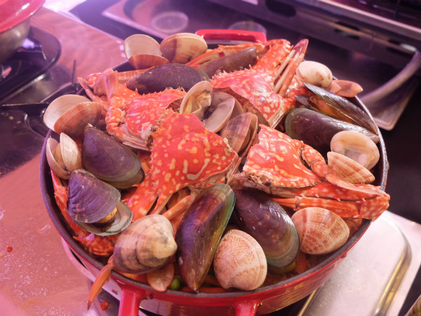 The paella took a bit over an hour to make. With some of the seafood already pre-cooked AND the vegetables prepared, cooking was a breeze for us. My group mate, who said that their home kitchen was her husband’s territory, had fun as she stirred and mixed. First, we sautéed the chicken, then we slowly added the rest of the ingredients.