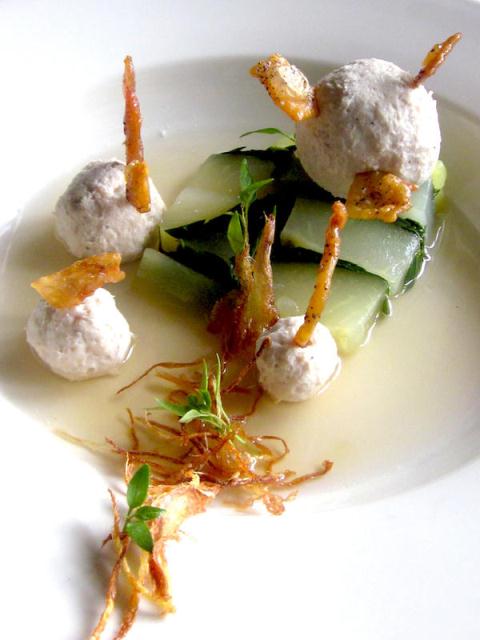 Believe it or not, this dish that you’re looking at is tinolang manok. Bongga-fied by Chef Ramon, of course. It’s actually composed of poached garlic-ginger chicken, crisp ginger and chicken skin, miniature chili shoots, papaya-malunggay terrine, and tinola broth.