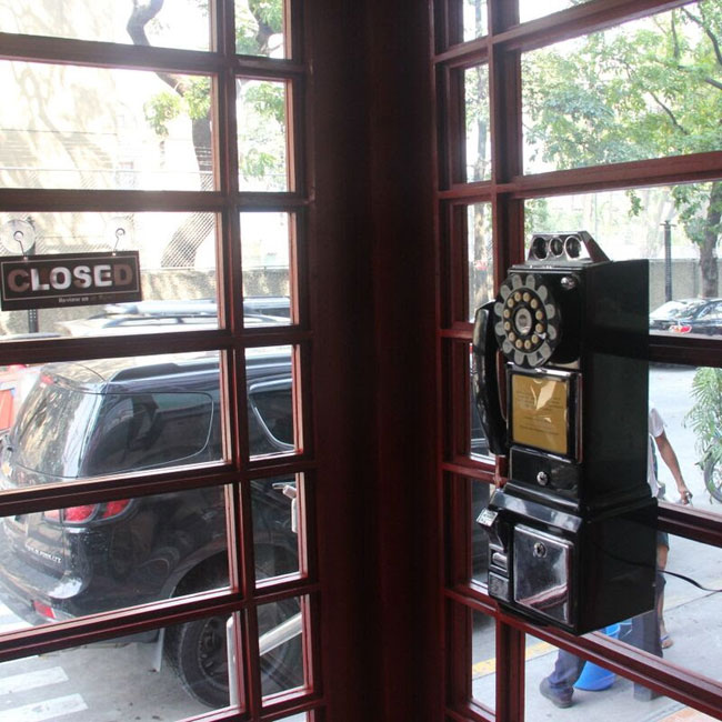 Inside the entrance, where we can’t help but play with the phone. That actually works, by the way.