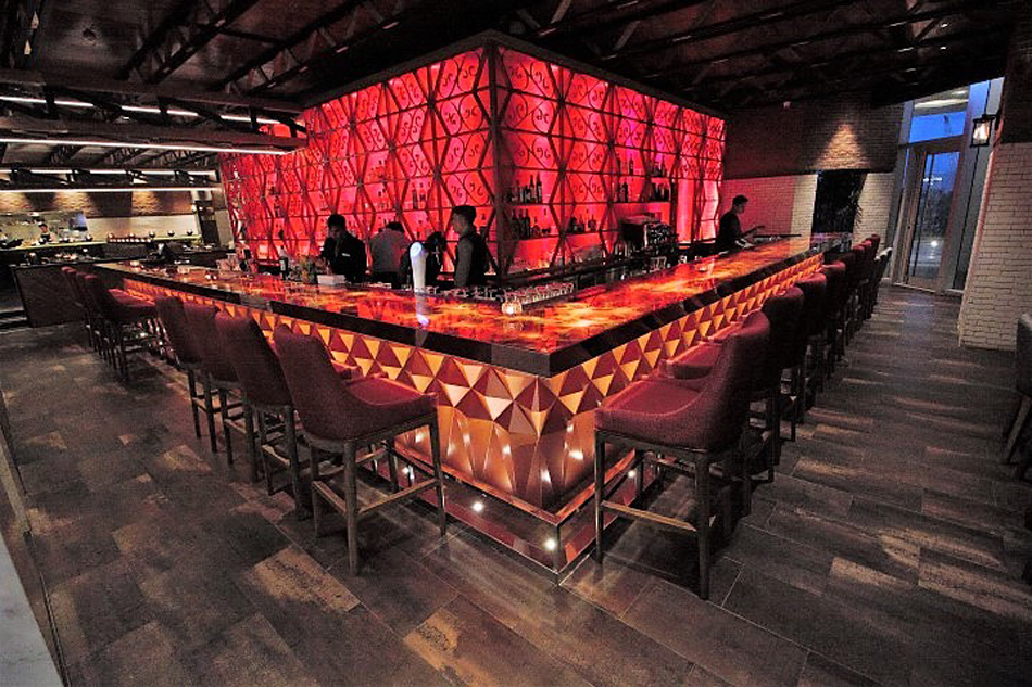 A lighted bar in red — the colors can change from time to time — gives a dramatic focal point, while bright open kitchen provides patrons with a framed view of quiet precision.