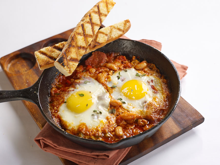 1. Country-style Chorizo & Beans. Savory, salty, sweet and filling, this sounds like the perfect breakfast for anyone suffering a hangover. Chorizo and beans topped with two eggs, baked and served in a skillet along with a piece of grilled Tuscan bread (PHP325).
