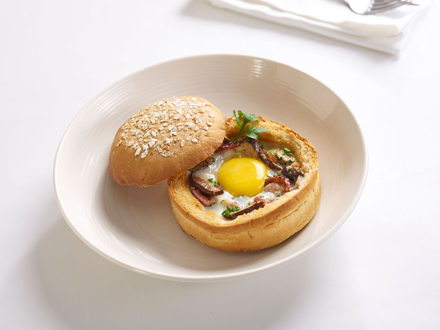 Strips of cured ham and shitake mushrooms swim in a bed of warm cheese sauce and then topped with a beautiful sunny side up egg, served in a baked bread bowl. It’s a complete meal, yo. (PHP295)