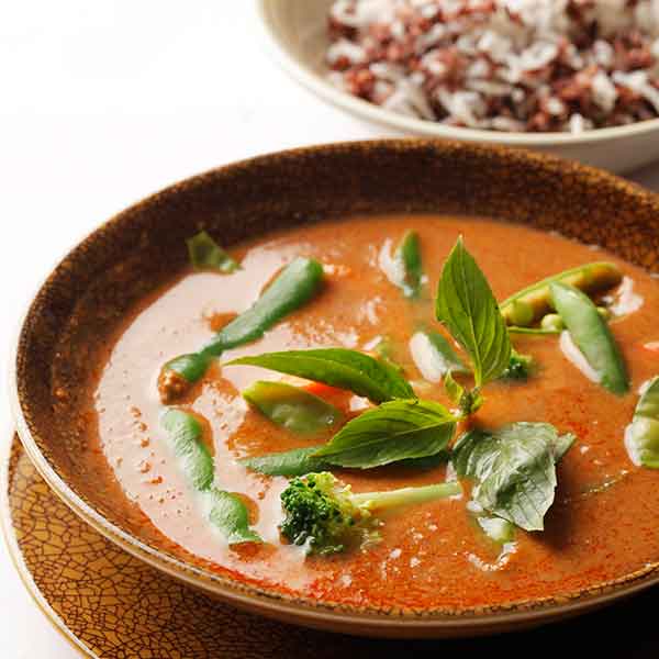 Think Penang curry with squash, tofu, steamed greens and organic rice (above), cold zucchini bisque with basil oil and celery shavings, and assorted jicama maki and vegetable California rolls with tamari sauce.