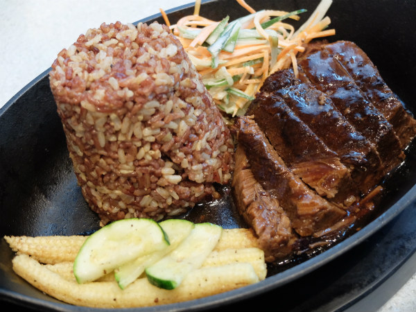 The fork-tender beef brisket, cooked for six hours, is seared on the griddle just before serving. Served with fresh cucumber-carrot slaw and rice, it was easily the favorite at our table.