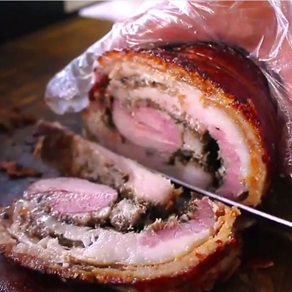 He has three other main draws at Chick ‘En Chops—baby back ribs, rosemary chicken, and barbeque chicken—but it’s his porchetta, which he stuffs more than 10 spices and herbs, that people come for. In the video below, de Jesus shows us how he prepares his restaurant’s famous porchetta.