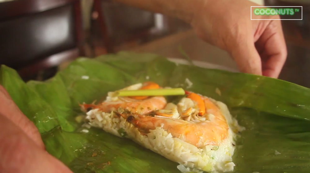 “You can play around with this recipe, it depends on what you find. You can put clams if you want to, but it’s that particular flavor of the seafood that you want to mix with the grated coconut and then of course the mint and lemongrass will give it a fresh aroma and citrusy flavor. The combination of seafood, citrus, mint, scallions, coconut and the banana leaf is a very Filipino flavor.”