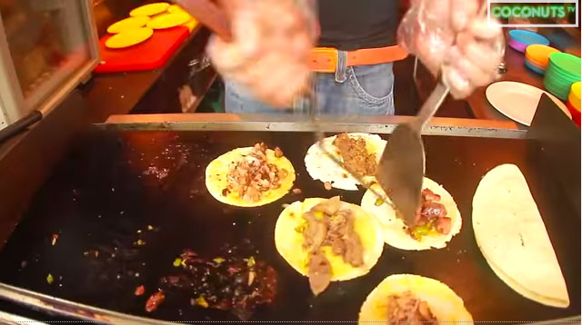 “And then when it’s cooked, he puts the carne asada on the taco, then he tops it with onions, guacamole, cilanto, and then it’s good to go.”