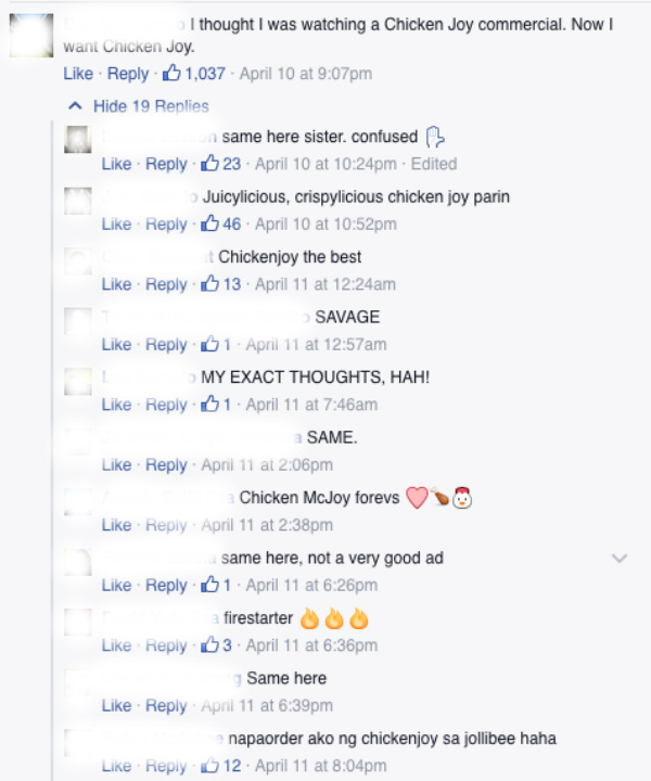 Most Filipinos thought that the advertisment is from Jollibee, who calls their best-selling chicken, Chicken Joy.