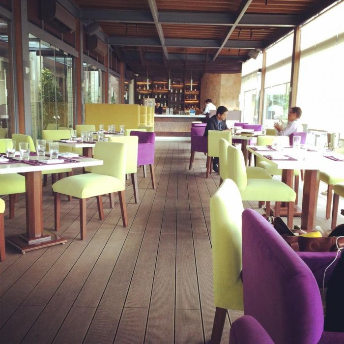 Inside Rafaelle (the last e is pronounced), the look is chic and modern. The rectangular space it occupies used to be a terrace for smokers. Now a bar has been added at the farthest end, and purple and mint green chairs add a refreshing two-tone palette to what would otherwise be a dull, brown room with deck flooring.