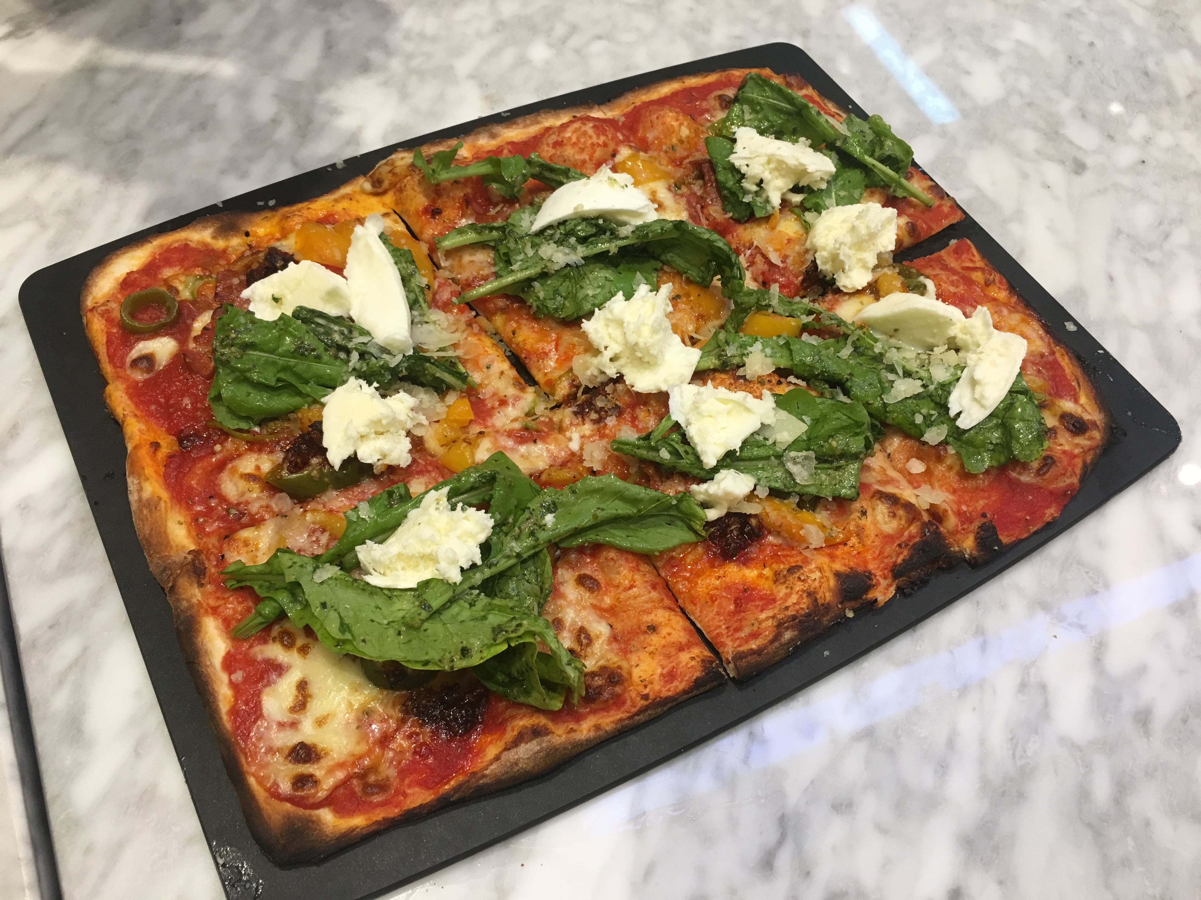 We enjoyed this pizza because it’s meatier than a margarita pizza but lighter and fresher than most all-meat pizzas. Though the arugula was a little wilted, it still added a peppery taste that went well with the fresh mozzarella.
