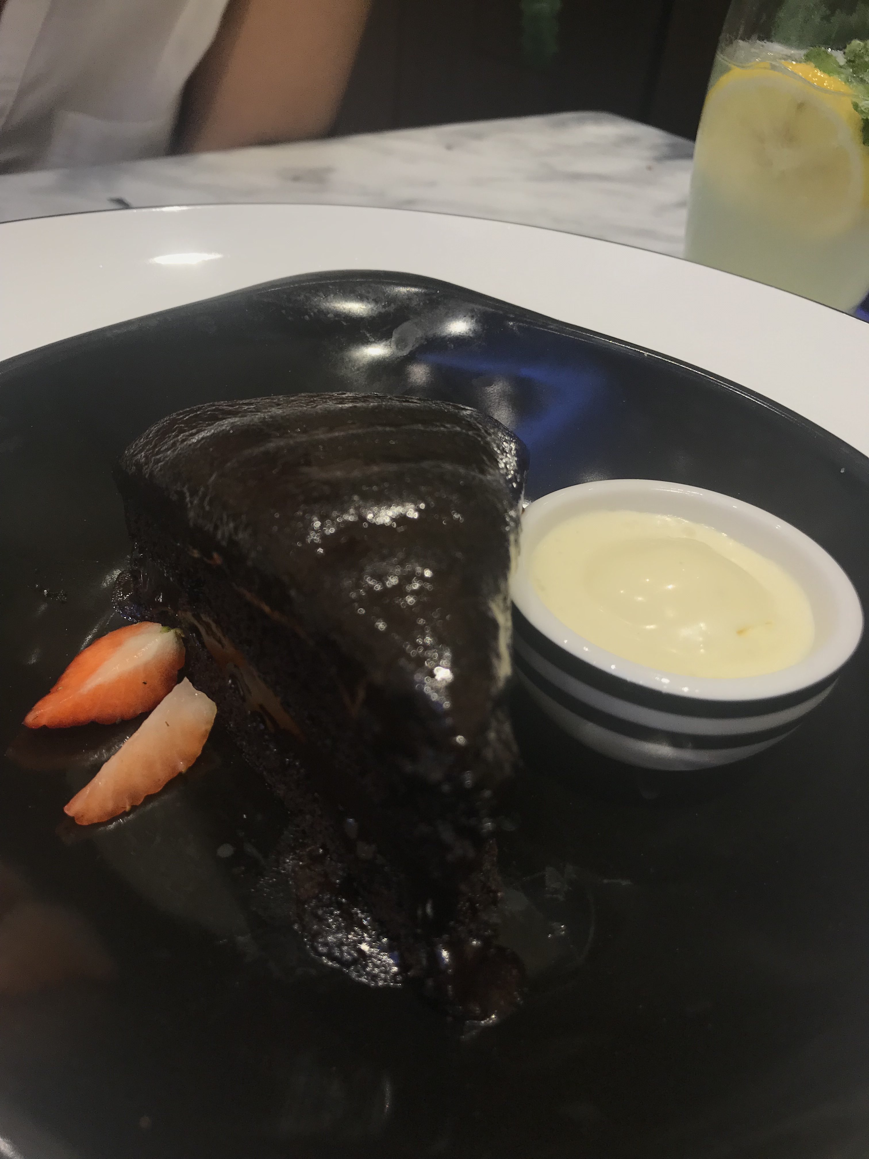 They have several dessert options but their signature chocolate fudge cake (PHP260/US$5.03) seemed like the best choice. It’s a slice of chocolate cake served on a hot skillet with a side of vanilla ice cream. The cake was warm and was like an inside-out chocolate lava cake. We appreciated that it had two different kinds of frosting: a gooey glaze on the outside and a thick sugary chocolate as a filling.