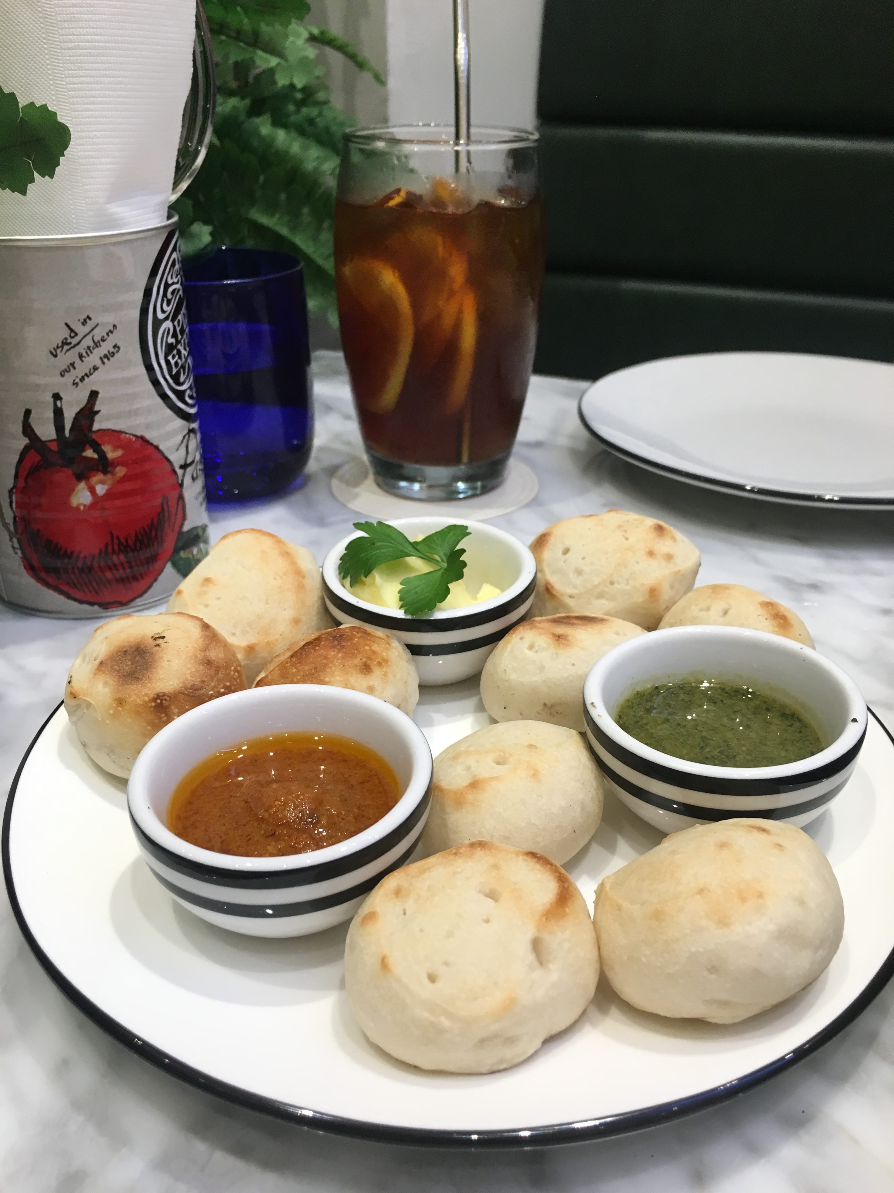 The bread comes with butter and your choice of pesto genovese (made with basil) or pesto rosso (made with sundried tomatoes).
