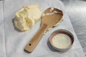 5. Knead the butter with a spatula for a minute or two to bring together the curds. If you want to add salt to your butter, now is a good time.