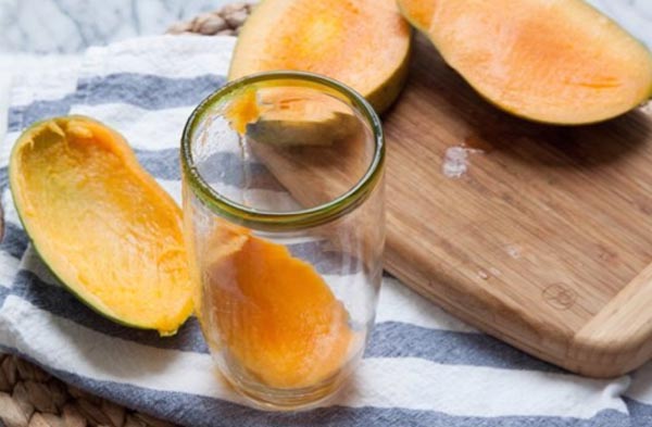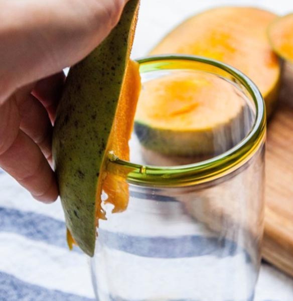 Step 3: Slide the mango down the side of the glass so the peel remains on the outside and the fruit on the inside.