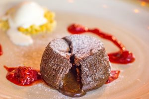 This decadent dessert will satisfy all your chocolate cravings. When sliced, the rich chocolate sauce oozes out of the cake, making for some A+ food porn. The chocolate lava cake is served with vanilla ice cream and raspberry preserves the perfect hot-cold and sweet-tart combo all in one dish.