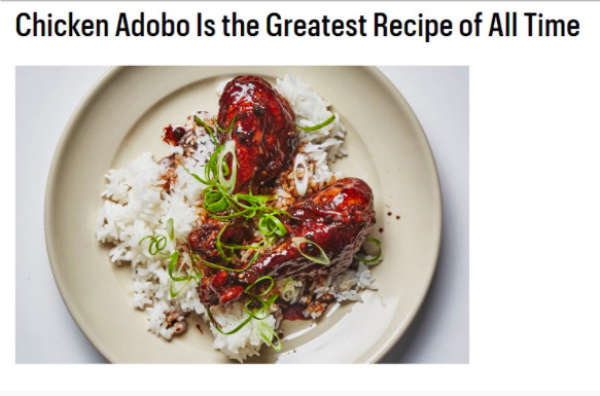 “No matter how you’ve prepared your adobo, there’s really no messing it up. That amazing fusion of soy, vinegar, garlic, and pepper in every version is a winning formula,” she wrote.