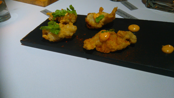 We started with pintxos — an appetizer made from a piece of toast with toppings typical of the Basque country — made from blue crab and hollandaise sauce on a piece of toast.