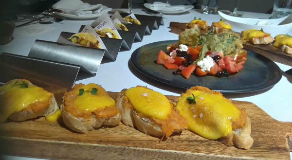 We started with pintxos — an appetizer made from a piece of toast with toppings typical of the Basque country — made from blue crab and hollandaise sauce on a piece of toast.