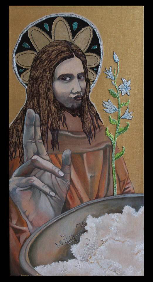 Tin Garcia: Nuestra Sra De Unli-rice, 2014, oil, ink, embroidery on canvas