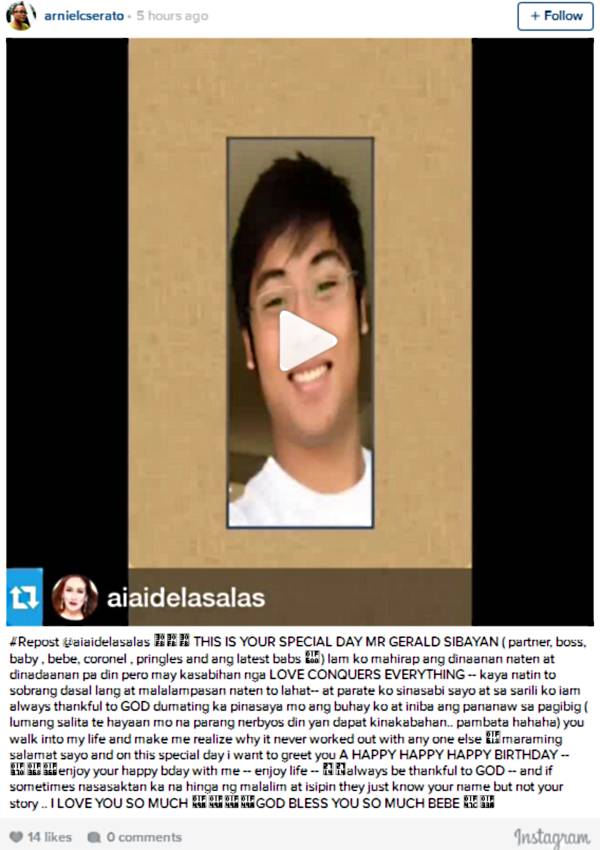 Part of Delas Alas’ message reas: “Alam ko mahirap ang dinaanan naten at dinadaanan pa din pero may kasabihan nga LOVE CONQUERS EVERYTHING—kaya natin to sobrang dasal lang at malalampasan naten to lahat—at parate ko sinasabi sayo at sa sarili ko iam always thankful to GOD dumating ka pinasaya mo ang buhay ko at iniba ang pananaw sa pagibig ( lumang salita te hayaan mo na parang nerbyos din yan dapat kinakabahan.. pambata hahaha)……you walk into my life and make me realize why it never worked out with anyone else.”