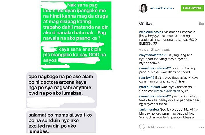 In the text message, Ai-Ai had asked Jiro to promise that he will not turn to drugs and instead work hard. “Opo, nagbago na po ako,” Jiro replied, saying his doctors thought so too, and that’s why he’s been allowed him to check out of the facility.