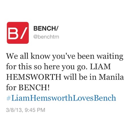 Bench just confirmed it. They’re flying Liam Hemsworth to the Philippines.
